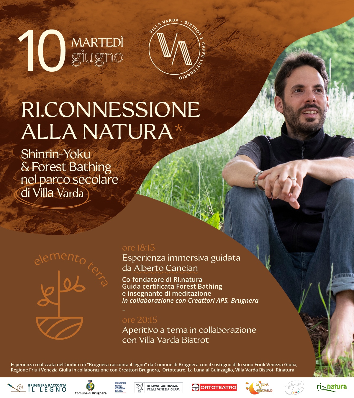 Dalle ore 18.15, esperienza immersiva di ri.connessione alla Natura secondo le tecniche del Forest Bathing guidata da Alberto Cancian, co-fondatore del Progetto Ri.natura, membro dell’Associazione Nazionale Guide di Bagni di Foresta e Insegnante di Meditazione Metodo Yogah. Il Forest Bathing nasce dalla pratica giapponese dello Shinrin-Yoku, una semplice passeggiata nella Natura con momenti di attivazione sensoriale e profonda consapevolezza. Un’esperienza adatta a tutti che dona ai partecipanti profondi momenti di pace, relax e armonia in connessione con la Natura. Durata 2h30 circa.